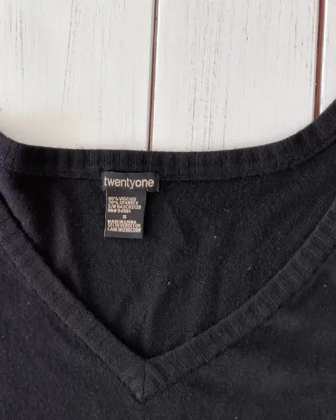 Suéter ligero negro twentyone. Suéter negro ligero y muy suave, cuello en v, manga larga, súper stretch (80% viscosa y 20% spandex). Talla: SMedidas: 35.5 cm hombros, 35 cm axila y 52 cm largo.