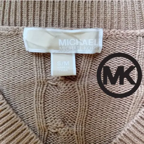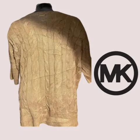 Suéter Michael Kors t L. Suéter Michael Kors t S/M queda mejor a L manga 3/4 cuello en V, placa metálica distintiva de la marca en cuello, 45cm hombros 65cm axilas. 68cm largo. Material 52% algodón 45% viscoso 3% angora. Aberturas laterales