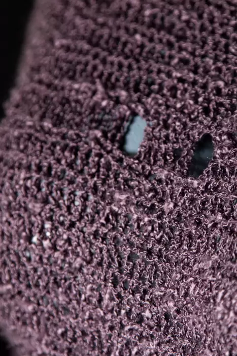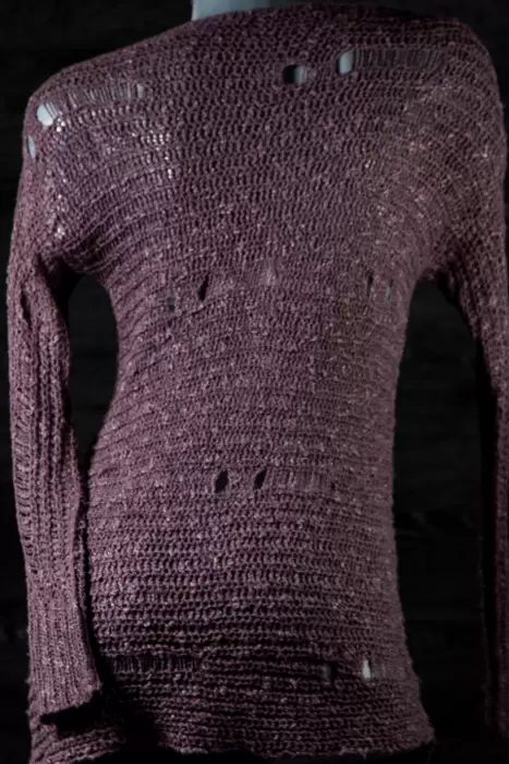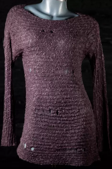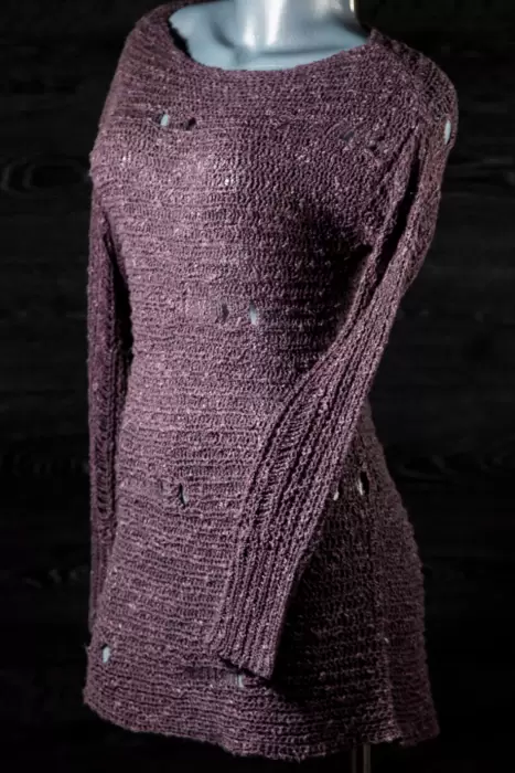 Suéter de tono morado oscuro, con estilo y detalle de diseño con orificios, para look informal. Es talla S pero puede quedar a una M. Mide 42 cm de axila a axila (estira) y tiene 79 cm de largo.