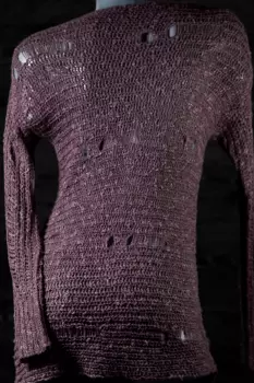 Suéter morado con mood de orificios. Suéter de tono morado oscuro, con estilo y detalle de diseño con orificios, para look informal. Es talla S pero puede quedar a una M. Mide 42 cm de axila a axila (estira) y tiene 79 cm de largo.