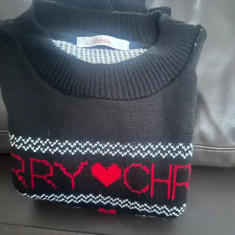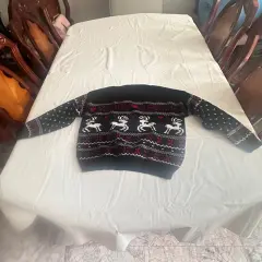 Suéter navideño con letras MERRY CHRISTMAS y detalles de renos blancos, es de color azul marino y detalles en rojo, está muy calientito y lindo, está nuevo