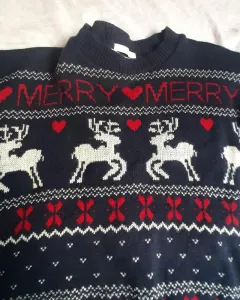 Sueter navideño, color azul marino, con grabado de reno, talla ch.Solo tiene una puesta