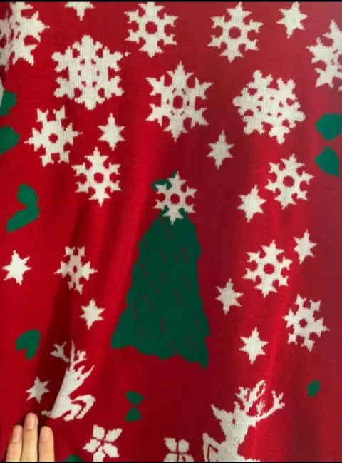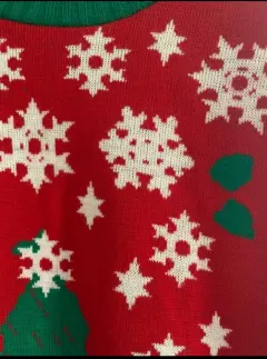 Sueter color rojo con diseño de arbol de navidad, copos de nieve y reno , bonito y no tiene ningún detalle.