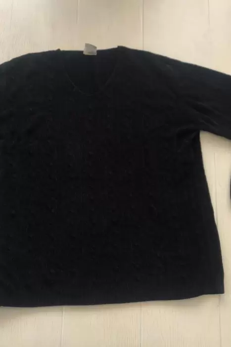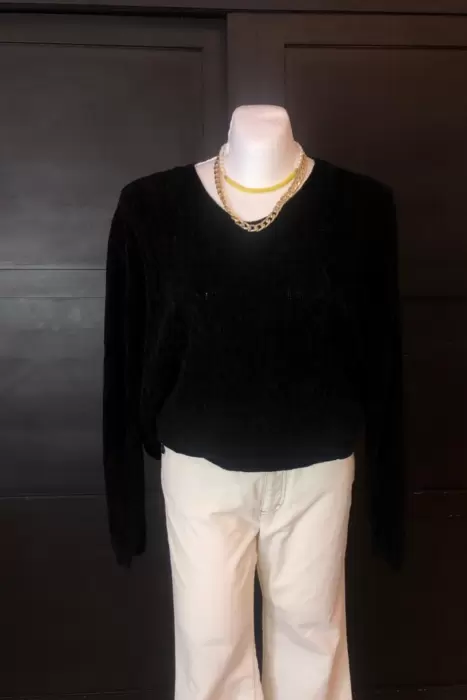 Sueter negro, con detalles decorativos de punto al frente, cuello redondo.Medidas:Hombro a hombro: 57 cmAxila a axila: 66 cmLargo: 79 cm