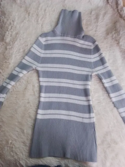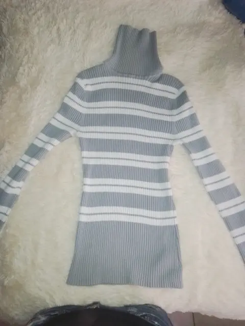 Sin defectos, talla L, tela elásticaSueter gris con rayodo blancoHecho: 7% rayón y 93% poliéster