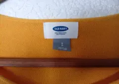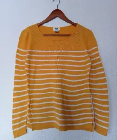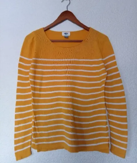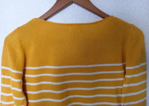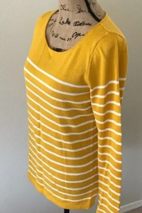 Suéter amarillo con rayas blancas, sin detalles, medidas de axila a axila 46 cm
