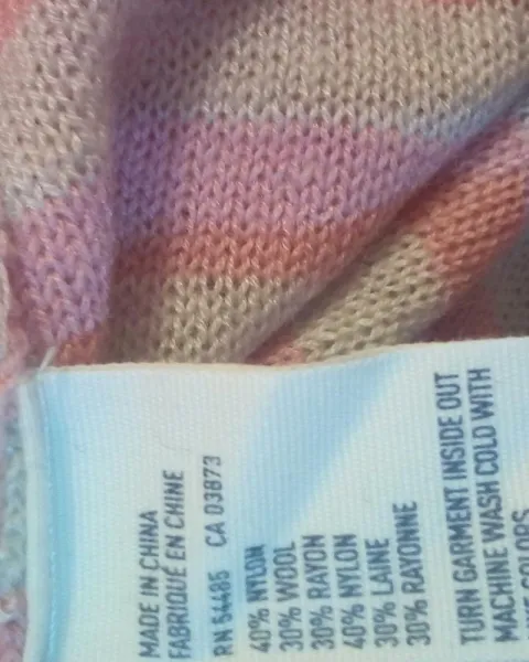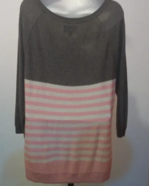 Suéter en tejido de punto, la parte del pecho en color gris oscuro con las costuras por fuera, el resto en diseño a rayas blancas y rosas, manga ¾, costuras por dentro. Talla L con las siguientes medidas:Ancho axila: 52 cmsLargo total espalda : 66 cmsPRENDA EN EXCELENTES CONDICIONES