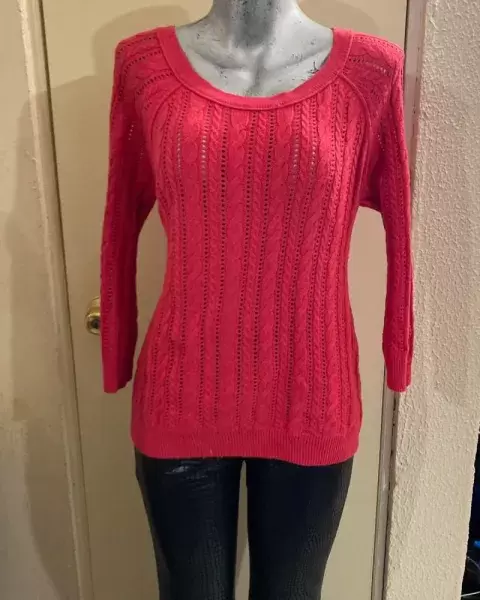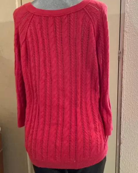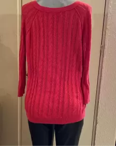 Sueter rojo. Sueter acanalado con trenzas, cuello redondo, llega abajo de la cadera