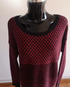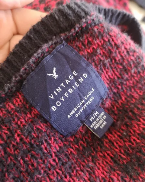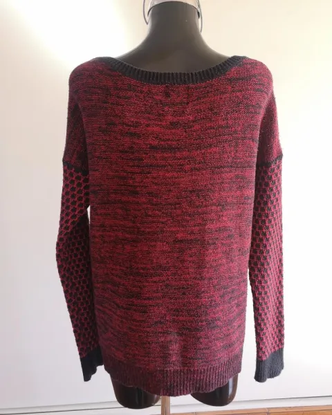 Suéter rojo con negro. Queda holgado, tiene algunas bolitas de uso
