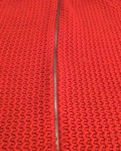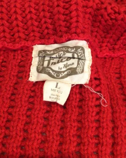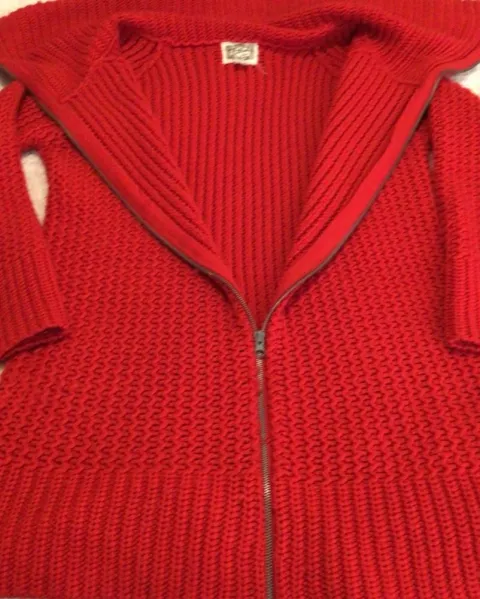 Suéter rojo largo. Suéter grueso largo, talla L.Detalles algunos hilos jalados por el cierre y algunas bolitas; no afectan el diseño. Hermoso y calientito.