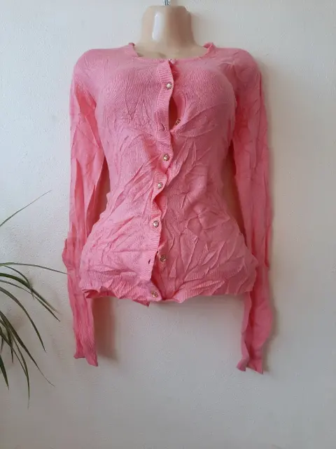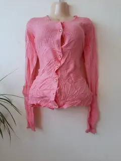 Sueter cardigan en tono rosita claro, talla ch pero el material estira así que también queda a una mediana, no tiene detalles.