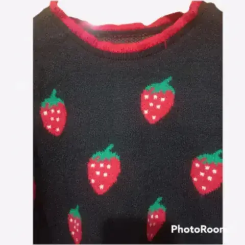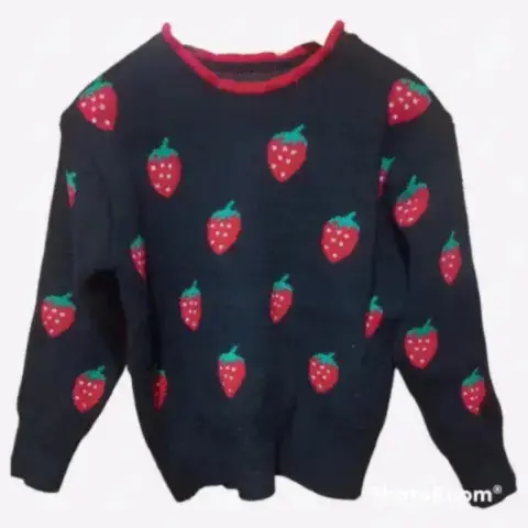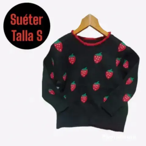 Bonito suéter negro talla S, con decorado de fresas, cuello redondo con lídea color rojo.Excelente para época de frío ya que es muy calientito.Marca independiente, por lo cual no tiene etiqueta.
