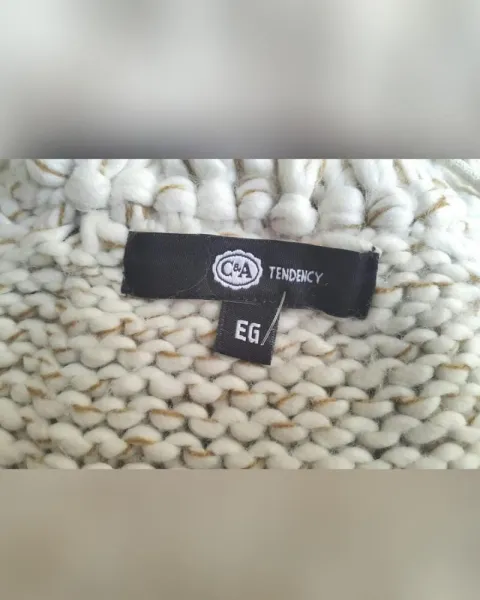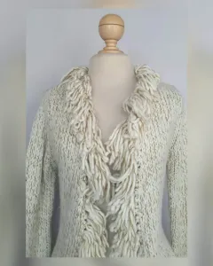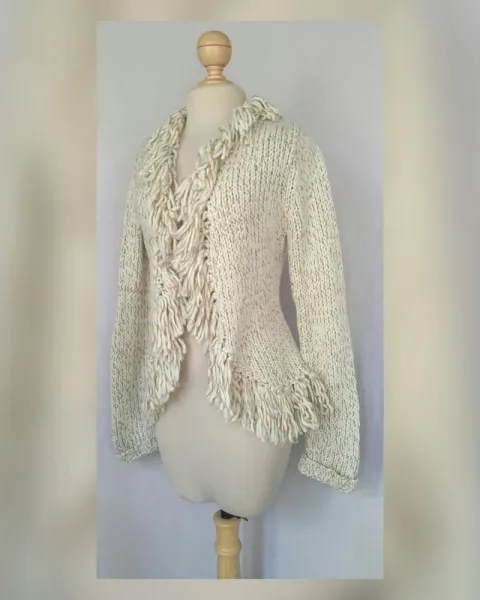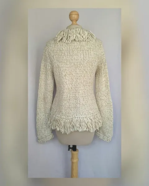 Suéter en tejido de punto tono CRUDO JASPEADO, cuello pico, cierre p/ganchillo, flecos en zonas cuello, frontal y baja. Talla XL (REDUCIDA, da mejor a L). Dimensiones cms: 38 hombro, 47 axila, 44 cintura, 56 zona baja, 61 largo, 75 largo manga. 100% acrílico. P/lavado en casa.***NUEVO, SE LE CAYO LA ETIQUETA ESTANDO GUARDADO***