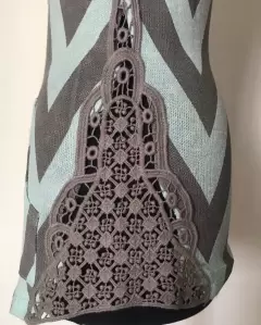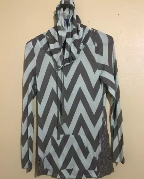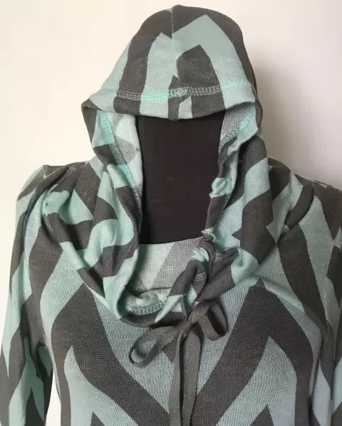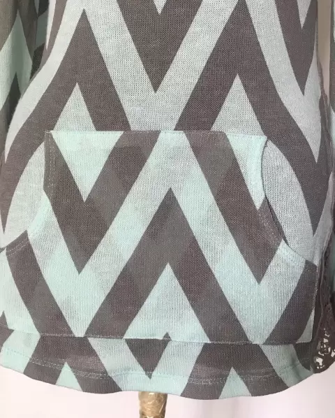 Suéter tejido delgado. Suéter con. Gorro, tejido de punto, color gris y verde agua, marca Miss Chevous, con aplicaciones a los costados y bolsa al frente, 1 vez usado. Sin detalles.