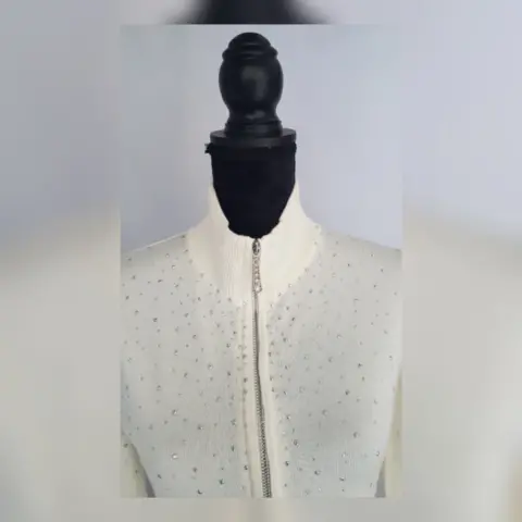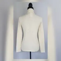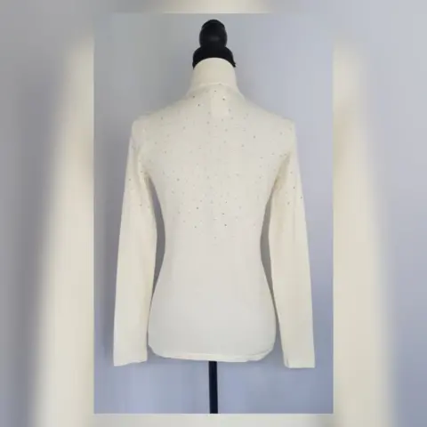 Suéter en tejido de punto tono MARFIL, cuello Perkins, cierre p/cremallera, aplique bisutería TRANSLÚCIDA/PLATEADA en zonas frontal, espalda y mangas. Talla CH (AMPLIA, da mejor a M) Dimensiones cms: 37 hombro, 44 axila, 40 cintura, 46 zona baja, 60 largo, 61 largo manga. 73% viscosa, 27% nylon. Para lavado en casa.***EL TONO EXACTO ESTÁ EN LA FOTO NÚM 5******EL BRILLO DEL APLIQUE DE BISUTERÍA ES MUY BELLO Y NO LO CAPTA LA FOTOGRAFÍA***