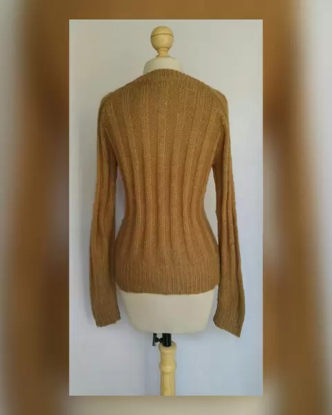 Suéter Tejido Punto c/Estructura. Suéter en tejido de punto c/estructura color OCRE DORADO TOSTADO c/hilo metalizado tono DORADO, cuello redondo, cierre p/botodanura y manga larga terminada en puño. Talla EG. Dimensiones cms: 51 hombro, 50 axila, 49 cintura, 51 zona baja, 61 largo, 74 largo manga. 97% acrílico, 3% fibra metálica. P/lavado en casa.***NUEVO, SE LE CAYÓ LA ETIQUETA ESTANDO GUARDADO***