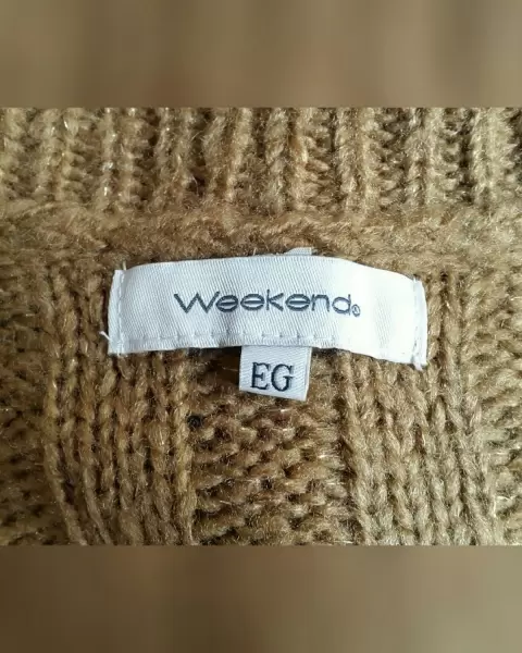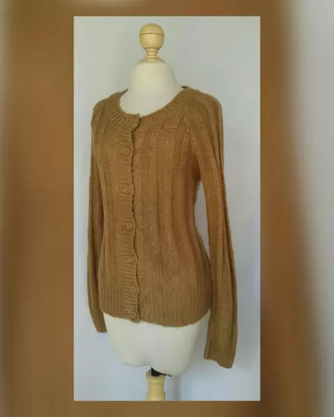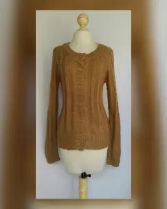 Suéter en tejido de punto c/estructura color OCRE DORADO TOSTADO c/hilo metalizado tono DORADO, cuello redondo, cierre p/botodanura y manga larga terminada en puño. Talla EG. Dimensiones cms: 51 hombro, 50 axila, 49 cintura, 51 zona baja, 61 largo, 74 largo manga. 97% acrílico, 3% fibra metálica. P/lavado en casa.***NUEVO, SE LE CAYÓ LA ETIQUETA ESTANDO GUARDADO***