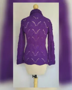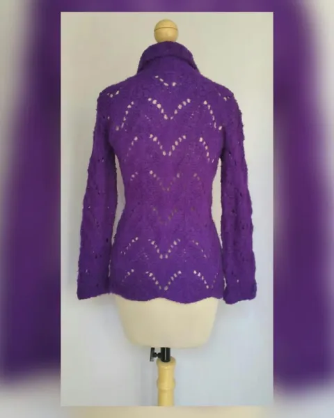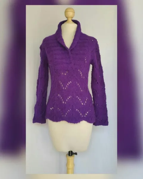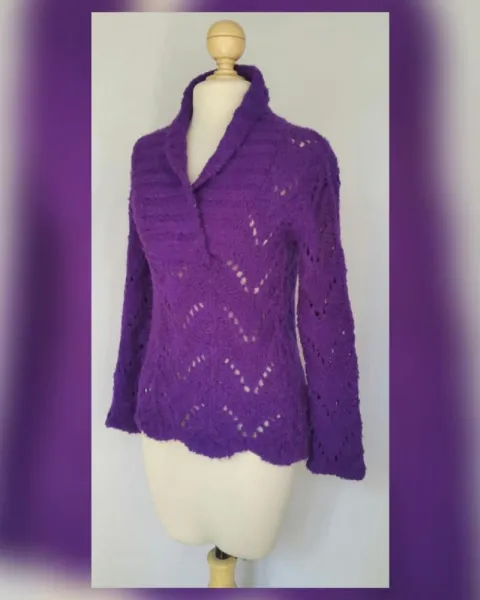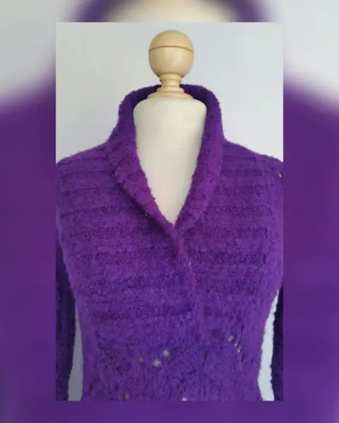 Suéter en tejido de punto c/estructura efecto canale color VIOLETA, cuello collar básico y manga larga. UNITALLA (da a M/L). Dimensiones cms: 47 hombro, 46 axila, 39 cintura, 53 zona baja, 62 largo, 59 largo manga. 100% acrílico. Para lavado en casa.***NUEVO, SE LE CAYO LA ETIQUETA ESTANDO GUARDADO***