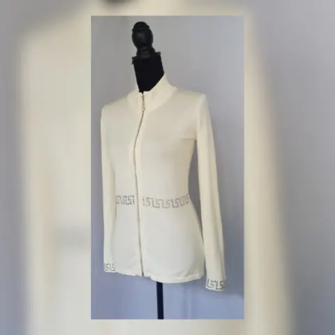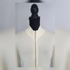 Suéter Tejido Punto con Aplique Bisutería. Cardigan en tejido de punto tono MARFIL, cuello Perkins, cierre p/cremallera, aplique bisutería TRANSLÚCIDA en zonas cintura y mangas. Talla CH (AMPLIA, da mejor a M) Dimensiones cms: 32 hombro, 42 axila, 40 cintura, 45 zona baja, 60 largo, 63 largo manga. 73% viscosa, 27% nylon. Para lavado en casa.***EL TONO EXACTO ESTÁ EN LA FOTO NÚM 5******EL BRILLO DEL APLIQUE DE BISUTERÍA ES MUY BELLO Y NO LO CAPTA LA FOTOGRAFÍA***