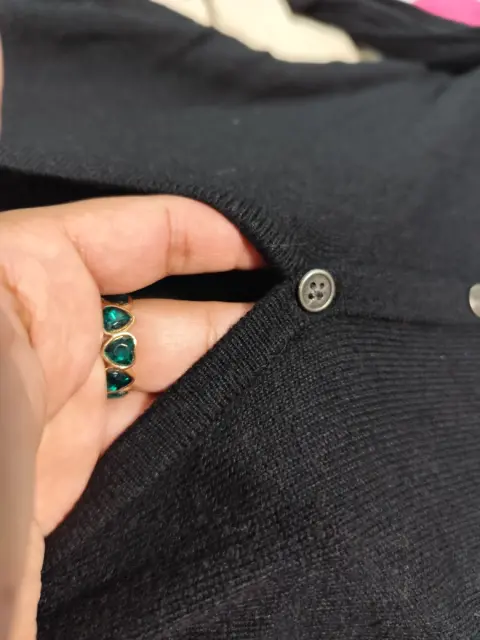 Suéter de punto, ligero, negro. Botones al frente, abren por completo. Corte peplum, manga larga. Escote V. Está muy lindo.