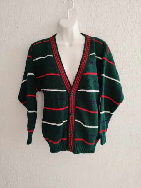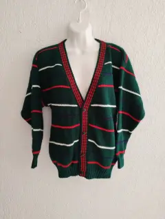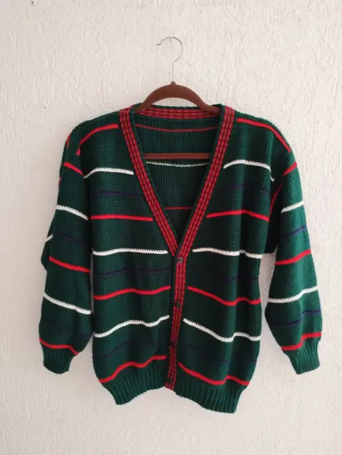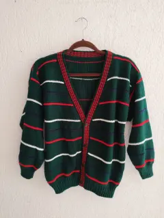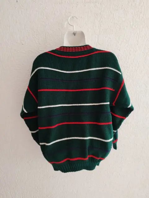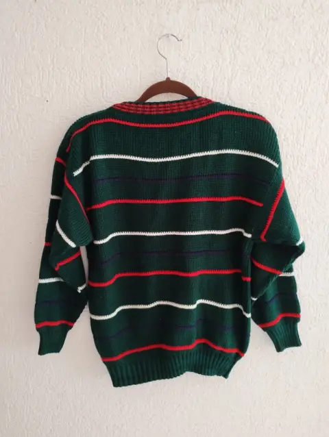 Hermoso suéter en color verde con rayas, es holgado.Medidas: 62cm de largo, 54cm de axila a axila y 48cm de mangas