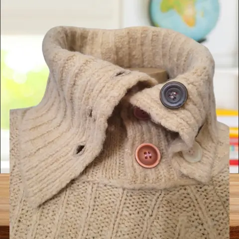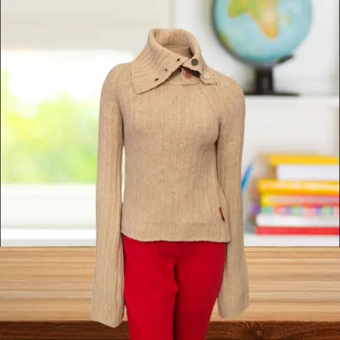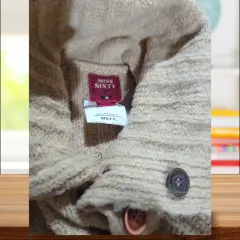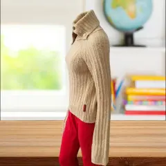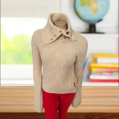 Suéter versátil Cuello Alto Miss Sixty, talla chica, color beige, cuello de tortuga, manga larga, acento de botones multicolor en cuello, hecho con mescla de acrílico, lana y nylon, mide 38cm de hombro a hombro, 40cm de axila a axila, 37cm de cintura, 22cm de cuello, 79cm de manga con 52cm de largo del hombro hacia abajo, nuevo a estrenar sin etiqueta en buen estado cosmetico.