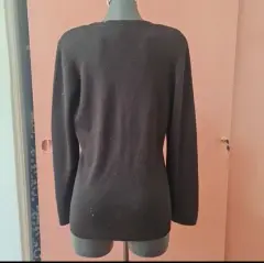 Tejido de puntoEl único detalle son las bolitas de pelusa q se le pueden quitarEstuvo guardado mucho tiempo así q recomiendo mandarlo a tintoreríaCon botones a todo lo largo del suéterCorte amplioHombros 43cmAxilas 53cmLargo 67cm