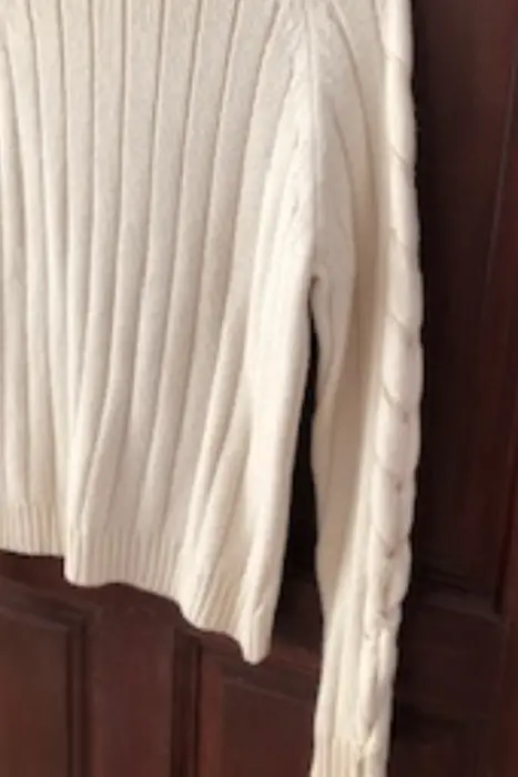 Sweater beige talla chica, con detalle trenzado en una de las mangas , marca Benneton