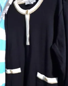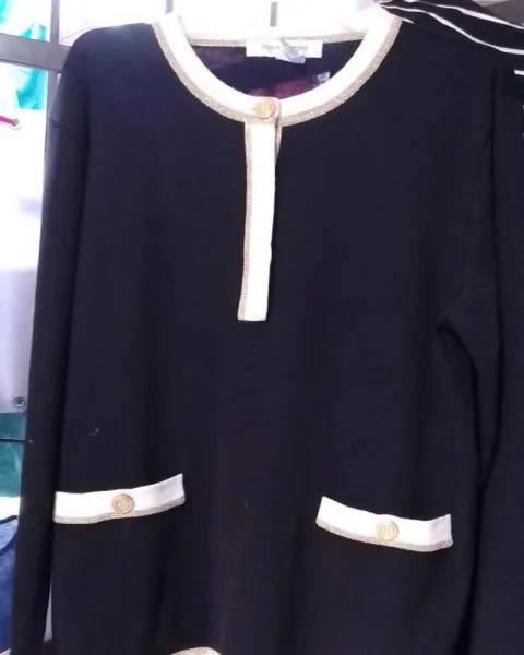 Suéter de cuello redondo con botones de la diseñadora Eva Picone de color negro realmente es un suéter formal trae líneas doradas botones dorados es un suéter serio y elegante está en muy buen estado es seminuevo pero están muy buen estado