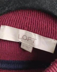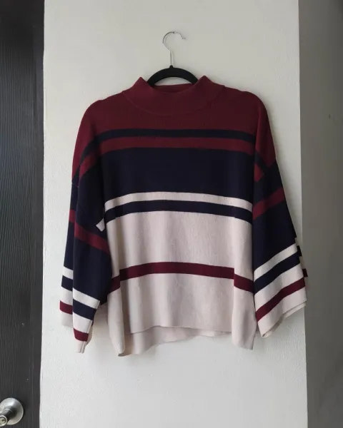 Sweater tejido oversized. Sweater tejido Loft en color beige, azul y vino. Composición. 40% poliester, 35% rayón. 25% lana. En perfecto estado. Talla M. Medidas. Axila a axila: 60cm. Largo: 52cm.