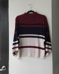 Sweater tejido Loft en color beige, azul y vino. Composición. 40% poliester, 35% rayón. 25% lana. En perfecto estado. Talla M. Medidas. Axila a axila: 60cm. Largo: 52cm.