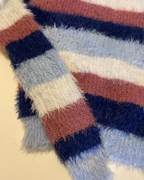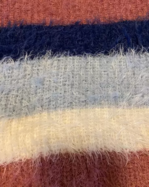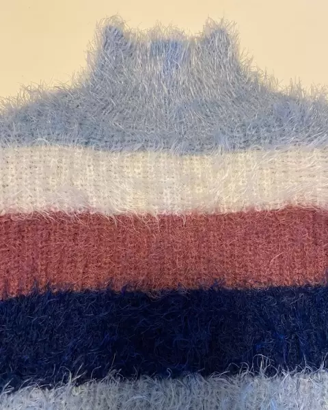 Sweter en rayas de colores, tela muy suavecita y textura de pelitos, súper bonito, estira, así que le va bien desde una talla S a M.