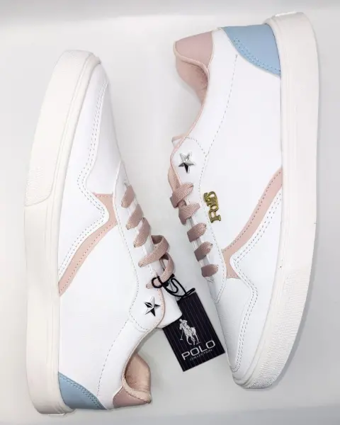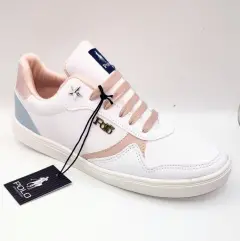 Tenis Polo Moderno de agujetas color blanco con rosa y azul, diseño vinipiel de material resistente a agua. Estilo casual urbano. Suela ligera antiderrapante. Número Méxicano #25cm. Pregúntame o Visita mi clóset para más modelos o numeración. En tu primer compra se te hace descuento si eres nuevo usuario en la App.