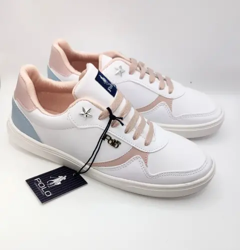 Tenis Polo Moderno de agujetas color blanco con rosa y azul, diseño vinipiel de material resistente a agua. Estilo casual urbano. Suela ligera antiderrapante. Número Méxicano #26cm. Pregúntame o Visita mi clóset para más modelos o numeración. En tu primer compra se te hace descuento si eres nuevo usuario en la App.