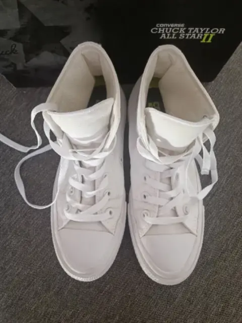 Converse Chuck Taylor II. Último precio!!!!!!☺️Están en perfecto estado el único detalle que tienen es una mancha de blanqueador en la plantilla de cuando se mandaron a lavar no afecta para nada ya que no se ve por estar en el interior,de super calidad combinan con todo están hermosos!incluyen un par de agujetas color negro...se mandan en su caja original...