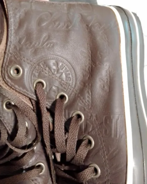 Converse de piel. Te regalo playera nueva (sin etiqueta) en la compra de los tenis!! Converse hermosos de bota, piel color cafe, grabados en toda la piel, unisex, talla USA mujer 8 y 6 hombre. Tienen unas cuantas puestas (4 o 5). Los trajeron de Minnesota, tienen un ligero detalle por falta de uso, tiene un puntito despegado de la orilla. Anexo foto del regalito si te animas a comprarlos!!!