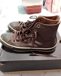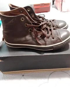 Te regalo playera nueva (sin etiqueta) en la compra de los tenis!! Converse hermosos de bota, piel color cafe, grabados en toda la piel, unisex, talla USA mujer 8 y 6 hombre. Tienen unas cuantas puestas (4 o 5). Los trajeron de Minnesota, tienen un ligero detalle por falta de uso, tiene un puntito despegado de la orilla. Anexo foto del regalito si te animas a comprarlos!!!