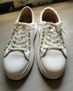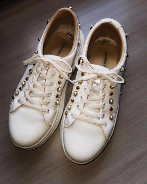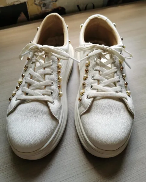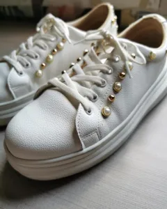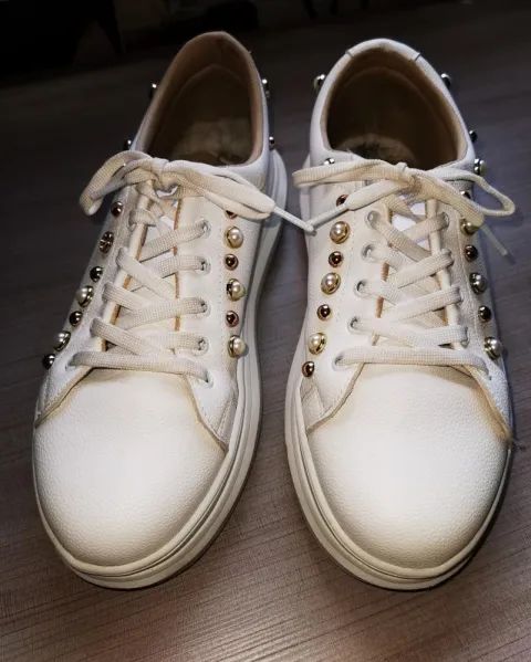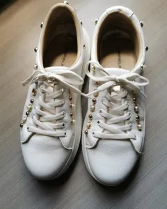 Bonitos tenis blancos con perlas y tachuelas doradas, algunas ya se han caído por el uso como se puede apreciar en las fotos. En excelente estado.TALLA 26MX