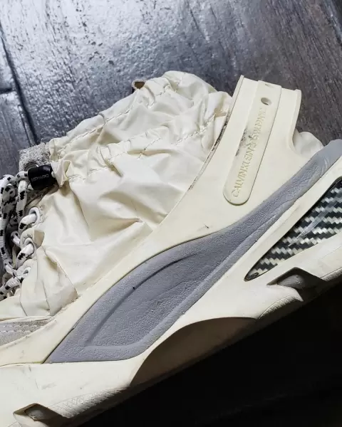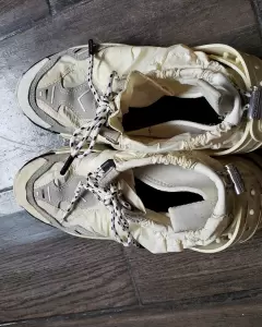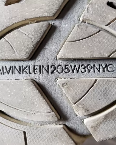 Tenis en nailon y tela • interior de espuma • suela de goma natural • altura de la suela: 4 cm • logo de Calvin Klein, la lengüeta, el talón, las agujetas y suela • talla 5.5. Cabe destacar que con el tiempo se hicieron amarillos y su color natural es blanco.