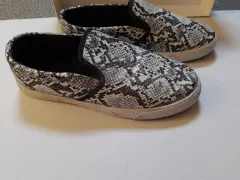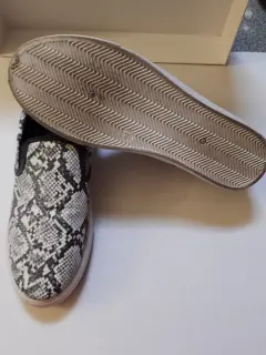 Tenis estilo Slip On de la marca Non Stop de Suburbia, con forro tipo piel de serpiente, se encuentran en un estado de "usado", cuyas imágenes muestran los símbolos de desgaste, como las rayaduras en las suelas, el estar algo flojos y amplio; de ahí en fuera, aún le quedan bastanten tiempo de vida. Puntualizo que son talla 27 MX / 10 US.