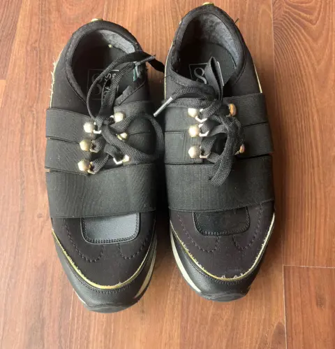 Bonitos tenis negros con poquita plataforma , elásticos que ajustan muy bien , plantillas confort ..se usaron súper poquito están en muy buenas condiciones.