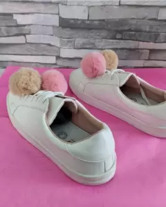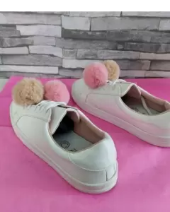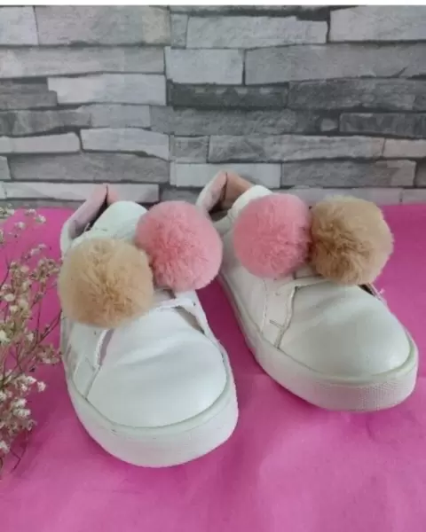 Tenis con pompones. Tipo casuales, color blanco con pompones, en perfecto estado. Los pompones se pueden quitar de las agujetas. Talla 26. Usados pero en buen estado y aun tienen durabilidad.