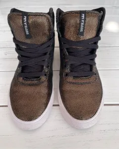 Tenis de bota dorados tornasol Supra. Talla: 23.5 cm, tipo bota, dorados tornasol, fieles a su talla. No tienen detalles.
