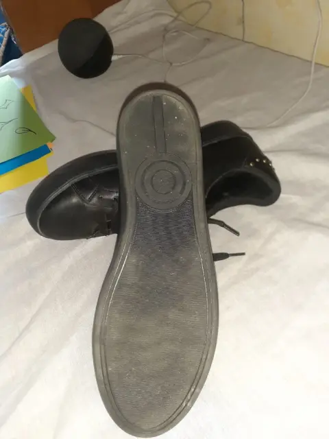 Tenis negros con aplicaciones de colores a los lados, número 24.5, una sola puesta
