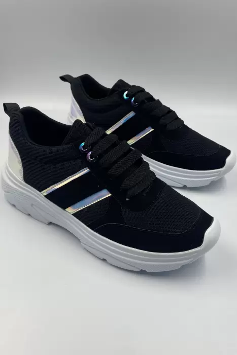 TENIS PARA DAMA. Si una cosa queda clara es que estos tenis te ponen al instante en sintonía con la moda. ¡Son unos sneackers imprescindibles!Por su color negro y detalles tornasol en el corte se convierten en objeto de deseo. Están fabricados con materiales textiles para mantener tus pies frescos.