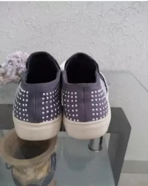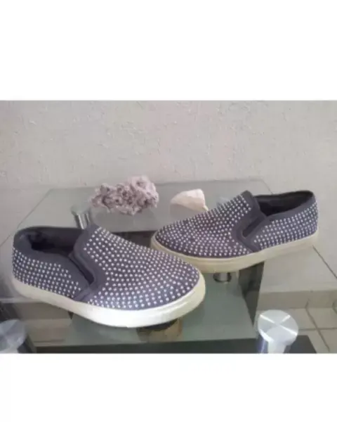 Tenis casuales Steve Madden en talla 3 , tiene detalles de piedritas pegadas en color gris,se le cayeron unas 3 ,eso se ve en las fotos, tienen muchísima vida