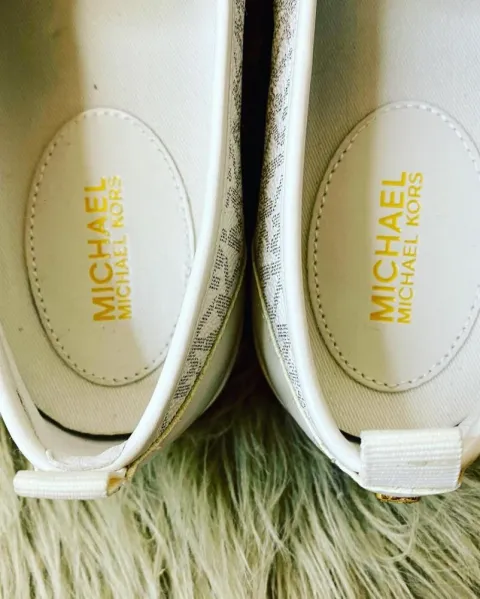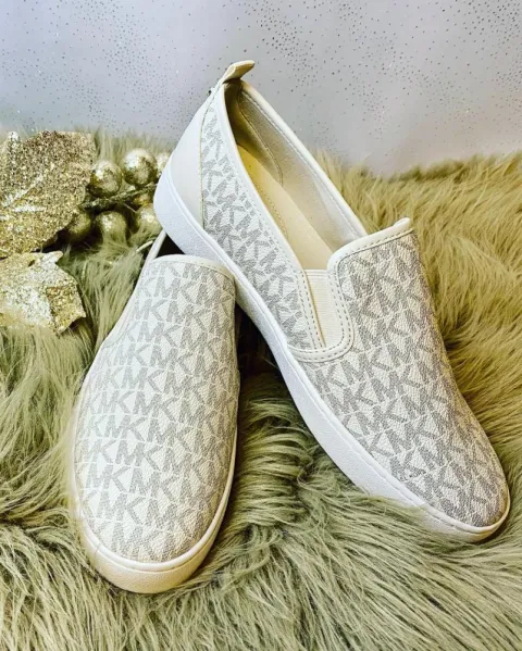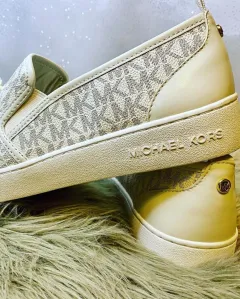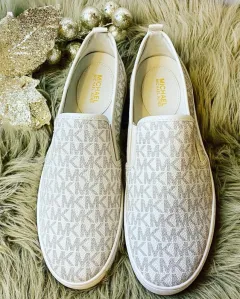 Tenis-zapato slip on MICHAEL KORS.. Hermosos zapatos/tenis MICHAEL KORS. Confeccionados en lindo color vainilla monogram, con detalles dorados y suela blanca. Súper cómodos, ideales para un look fresco. Los puedes llevar a cualquier evento. Talla: 26 México. Producto nuevo, sin caja. ¡Llevalos contigo a todos lados!