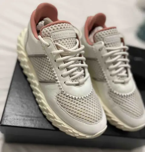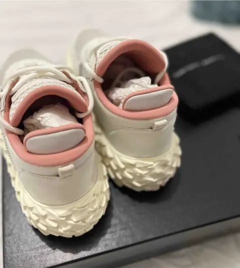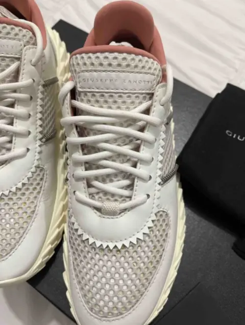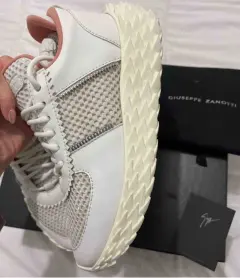 Urchin mesh panelled sneakers en piel de becerro de color blanco de GIUSEPPE ZANOTTI con puntera redonda, cierre con agujetas en la parte delantera, parche del logo en la lengüeta, plantilla con logo, lengüeta en la parte posterior y suela plana. Talla 4MX caja original, certificado y cubrepolvo!🫶🏻