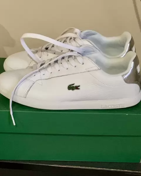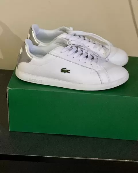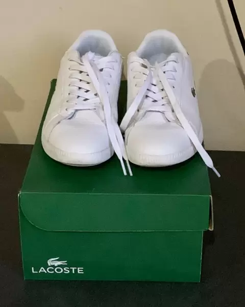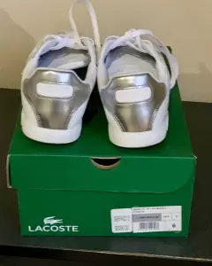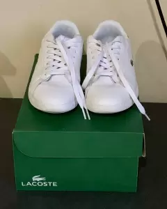 Tennis blancos marca Lacoste originales. Usados un sola vez. Me quedaron chicos, pero estan divinos. Vienen real a su numero solo que me aferre a que me quedaran.