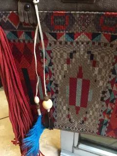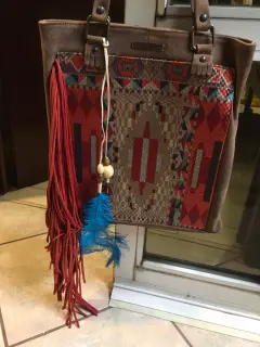 Linda bolsa boho chic Corazón de melón. Modelo Morela. Completamente nueva. Hecha en piel y aplicación textil de telar. Plumas de aves reales. Cintas y estoperoles. Una hermosa pieza.
